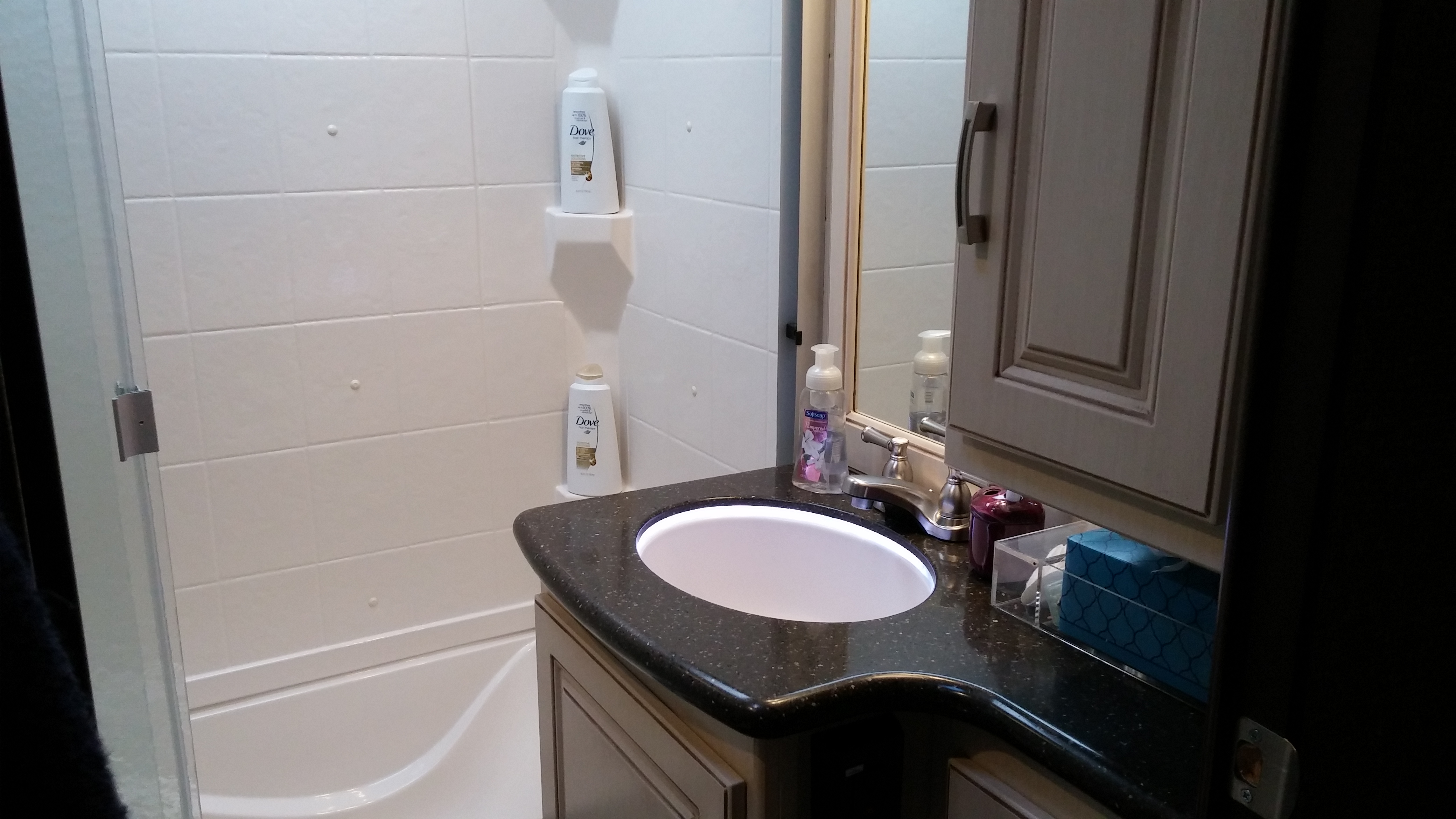 Some people have asked if we have a bathroom. Yes we do, two of them in fact. Here are a couple of pictures of the main bathroom with shower: