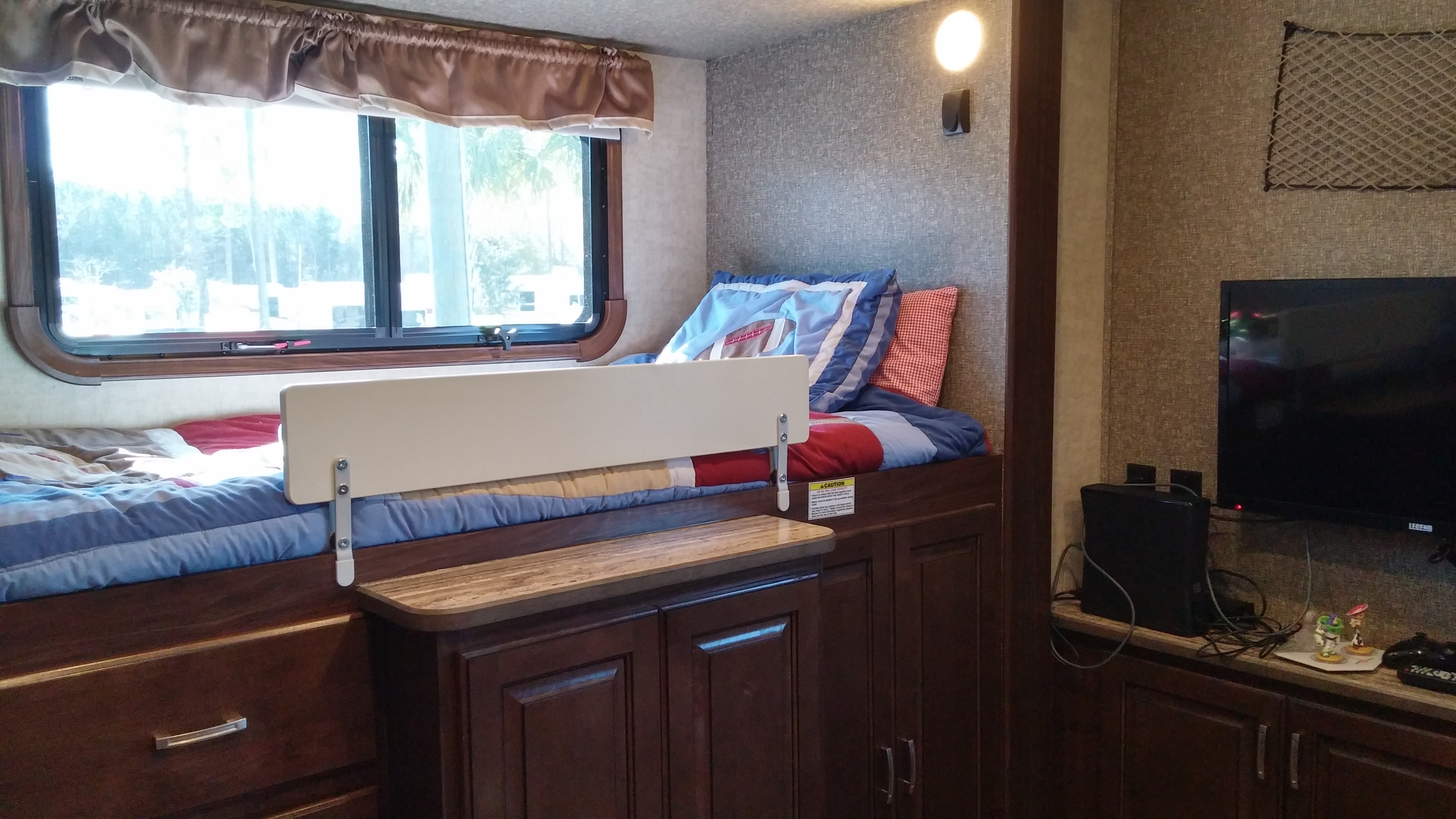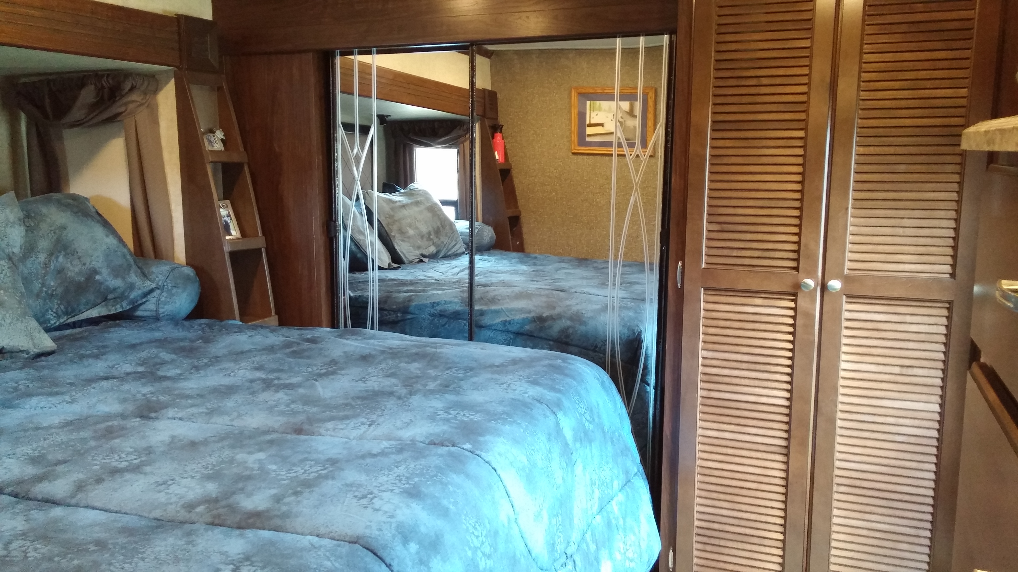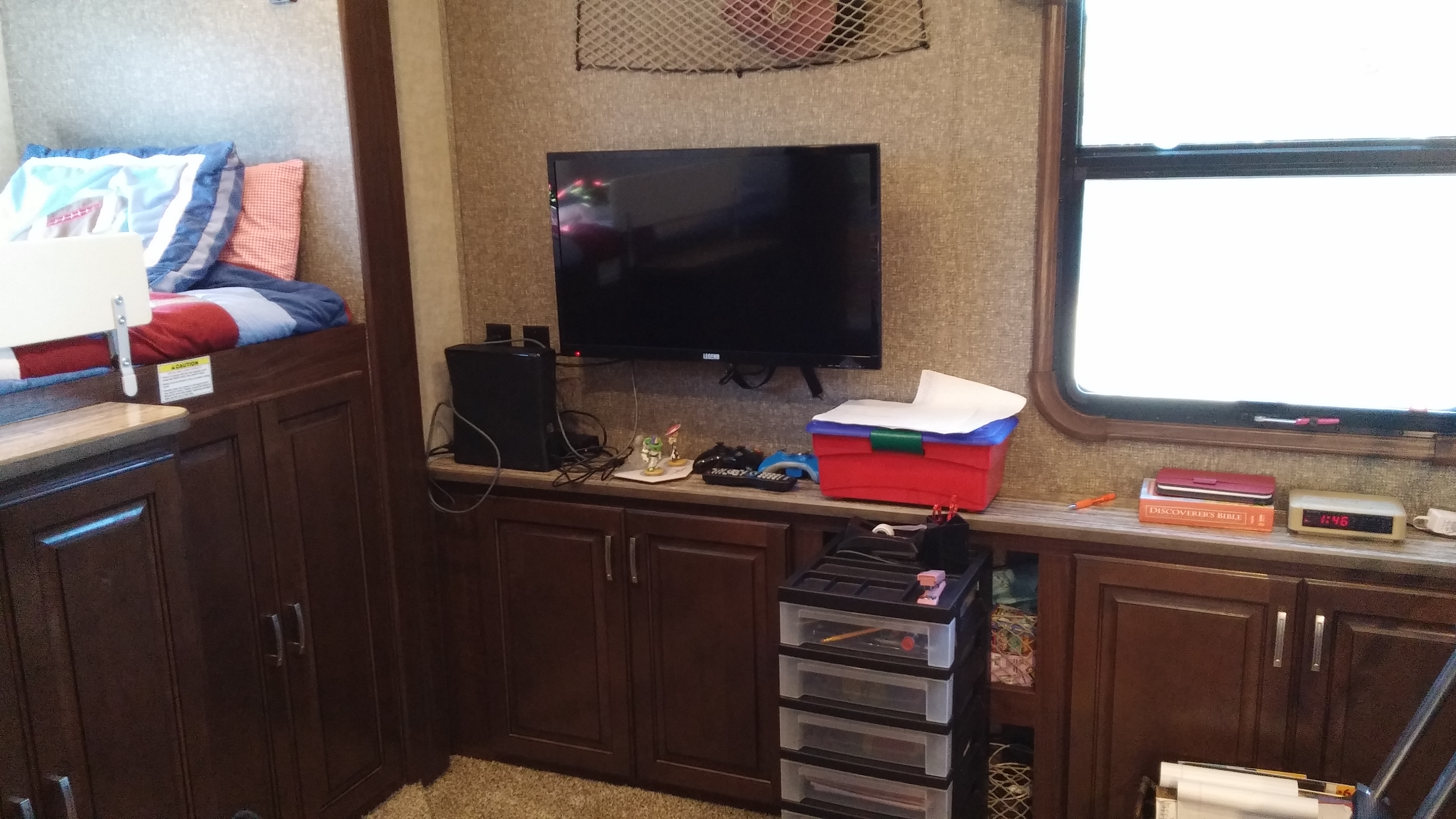 These next pictures are of the boys’ room. The first one is Jesse’s bed with dresser drawers and closets underneath.