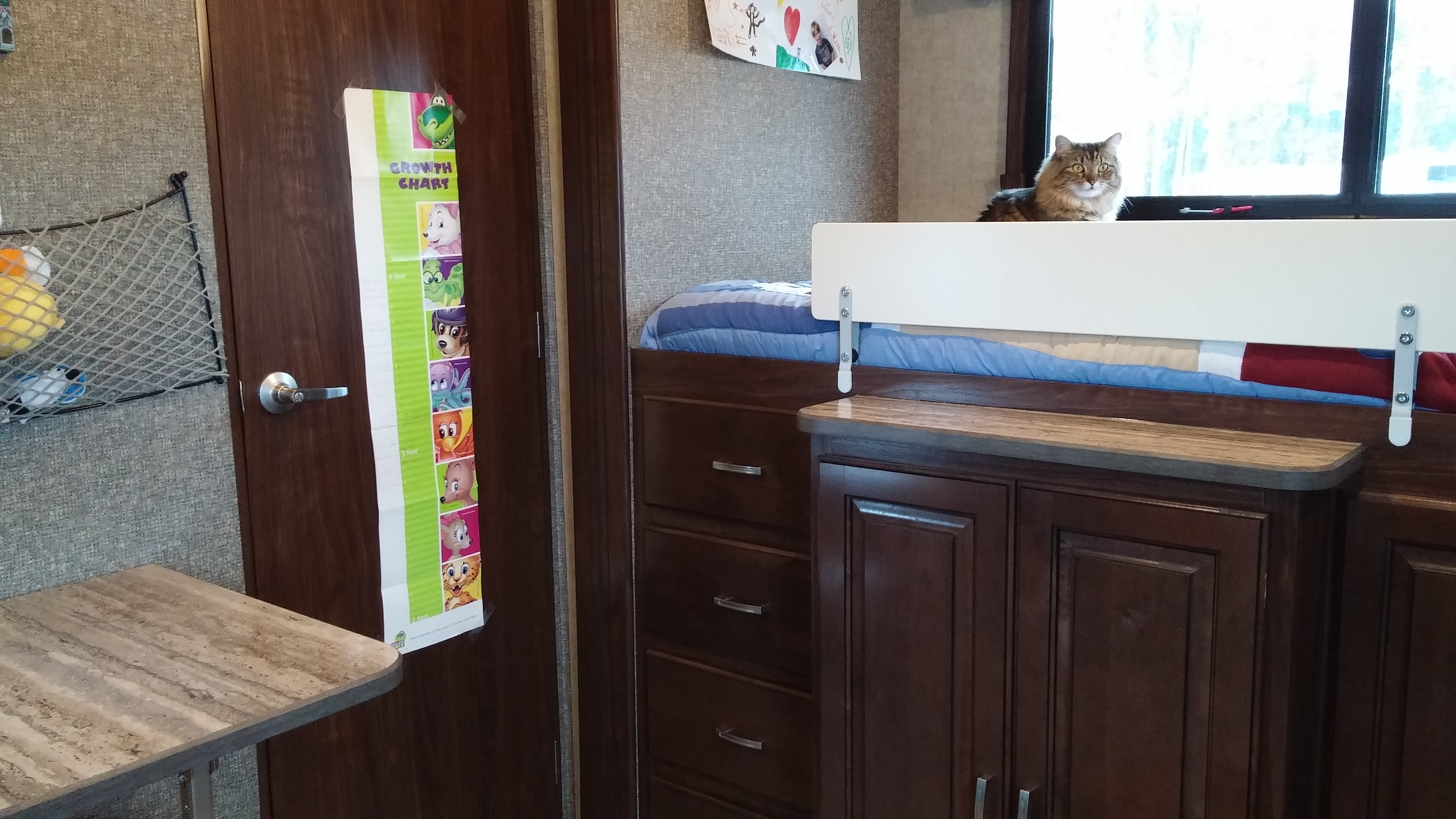 Another picture of their room facing the other direction with Fat Cat up on Jesse’s bed. Their little bathroom is behind the door.