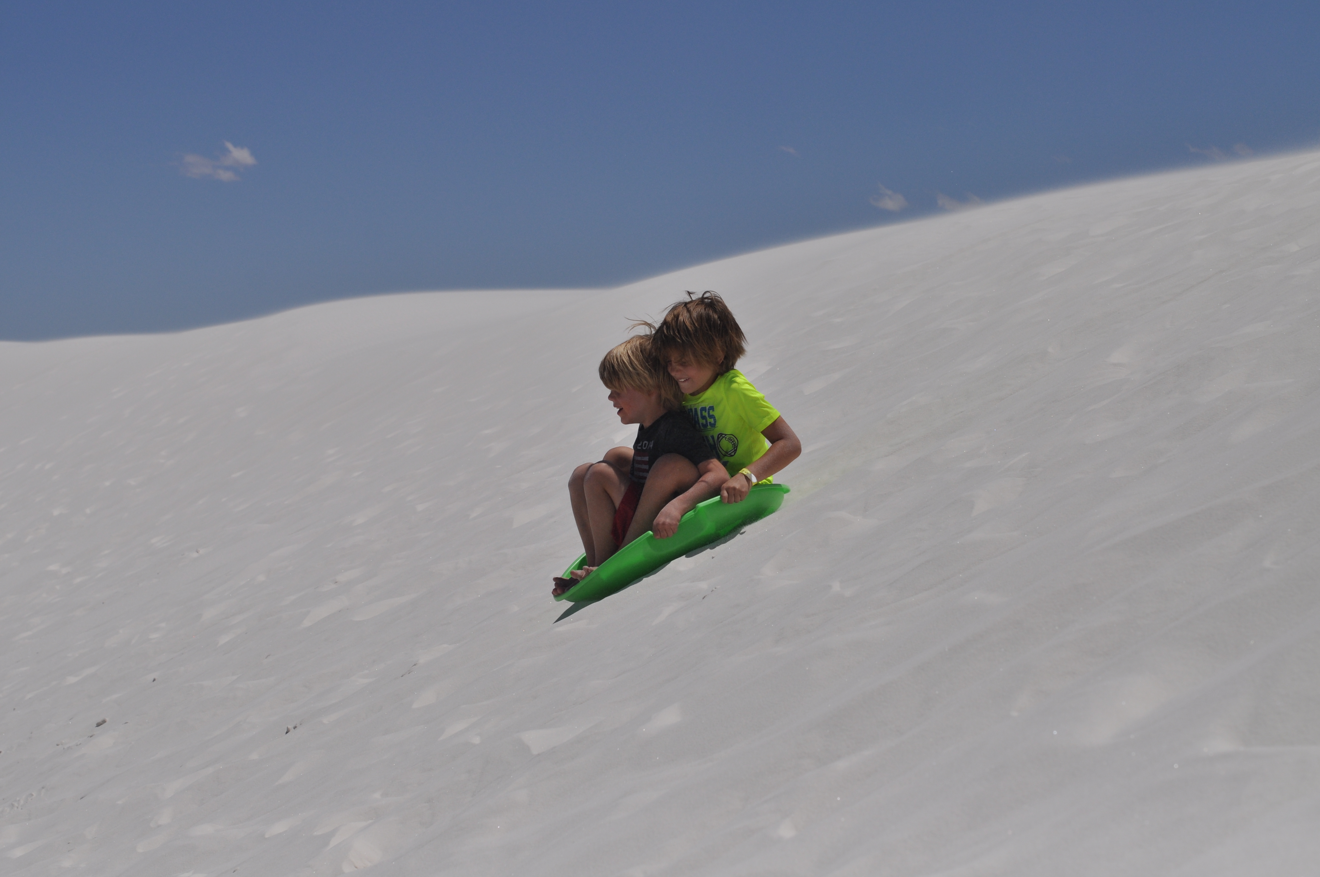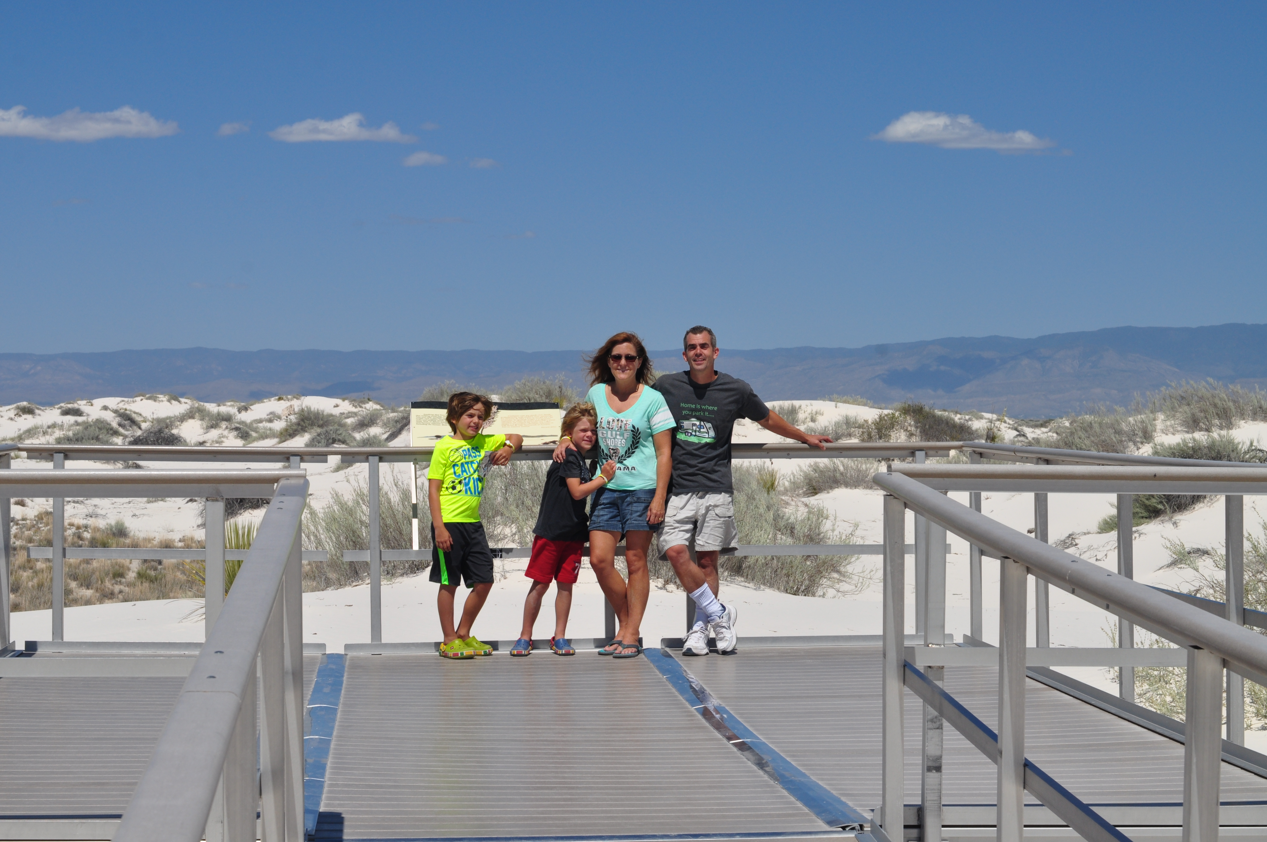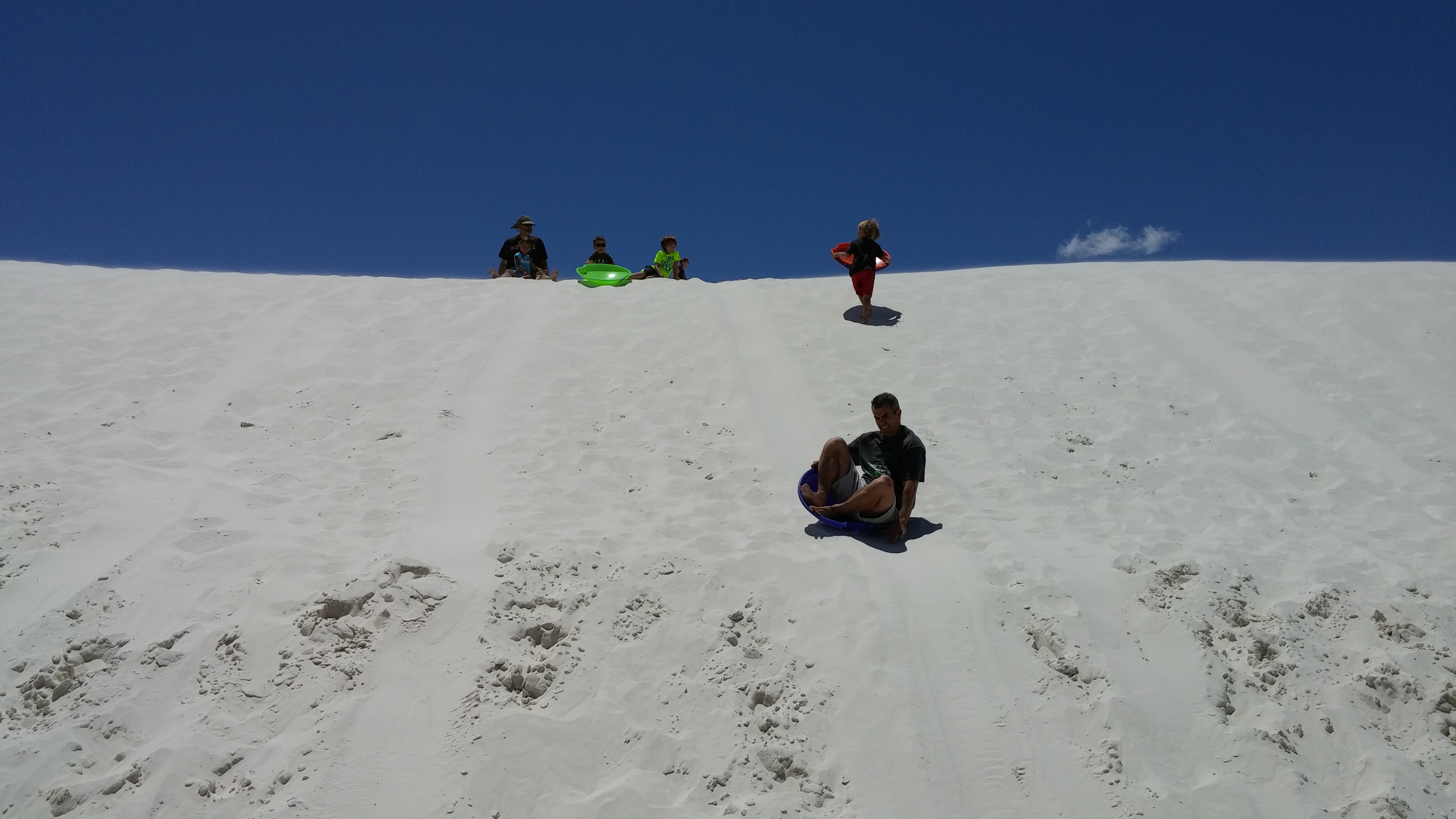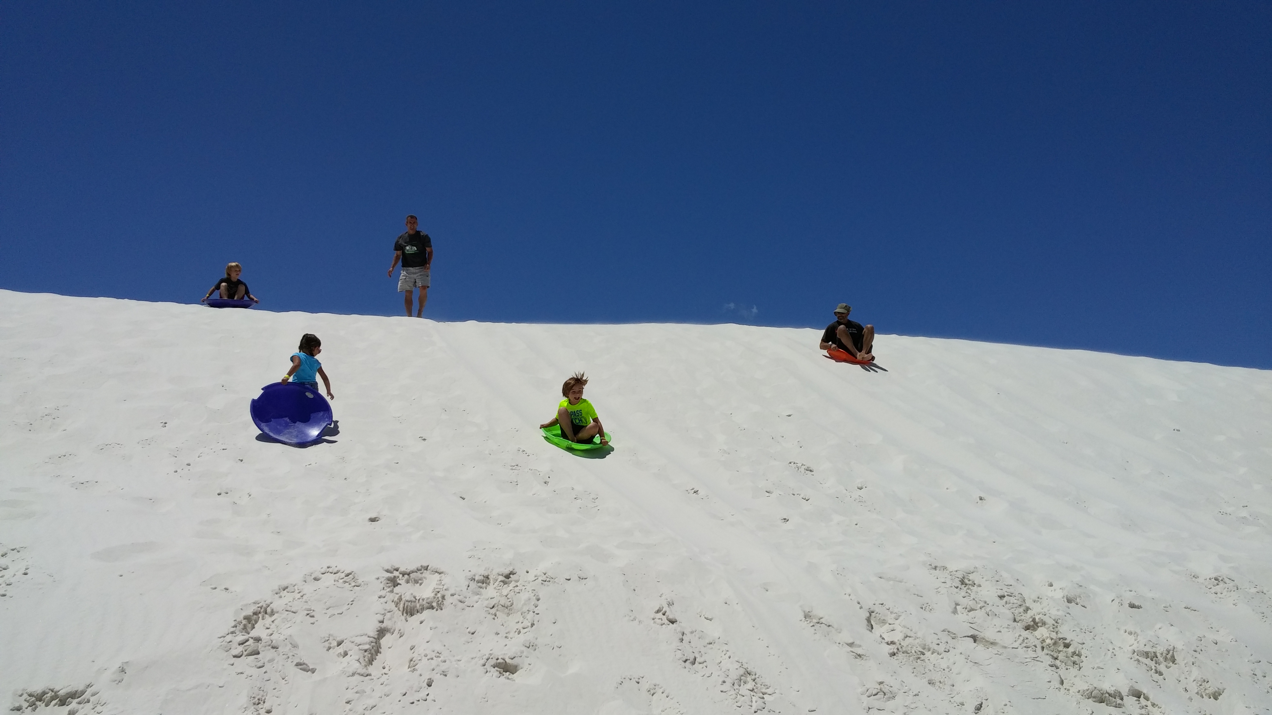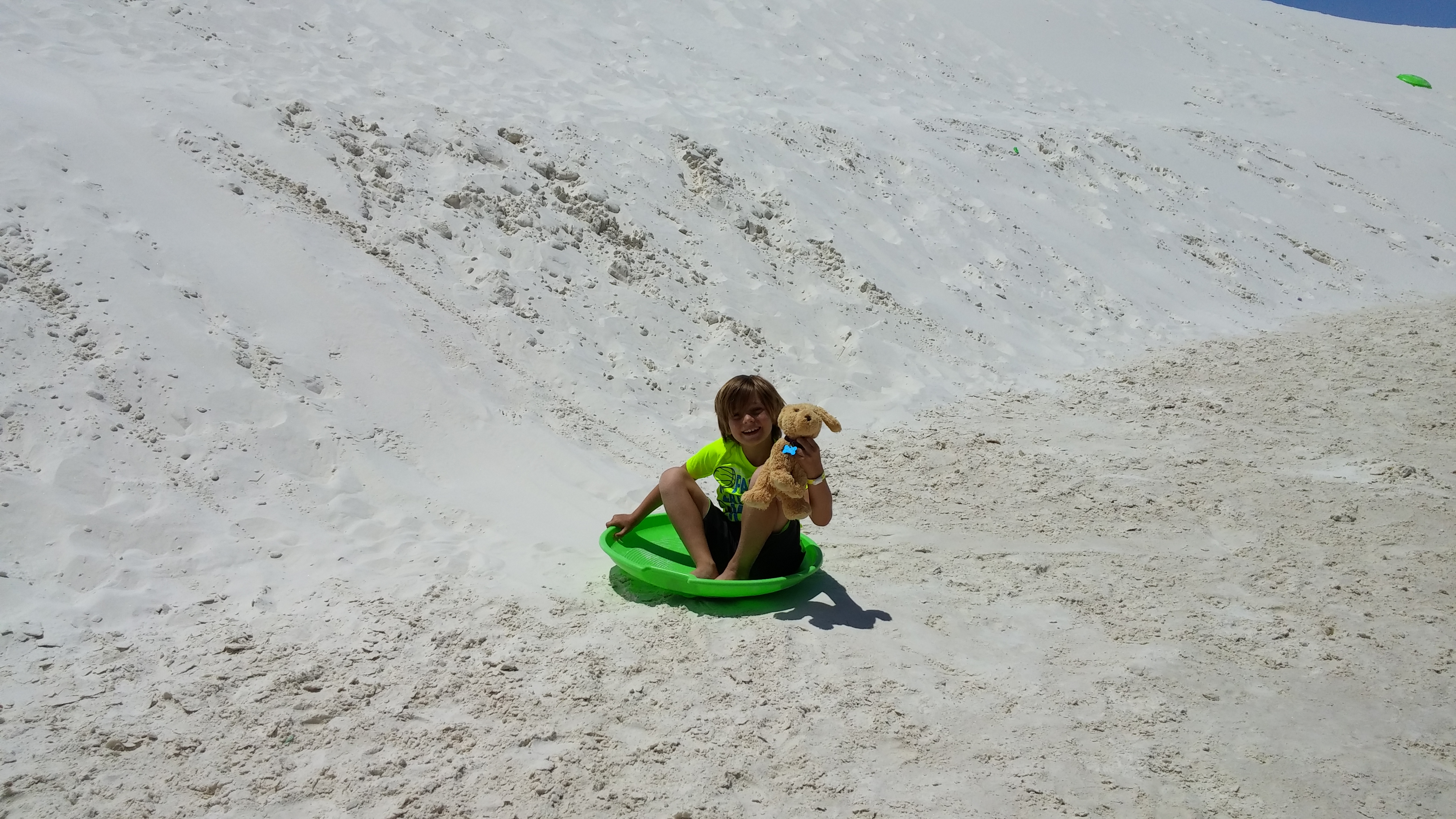 While visiting Las Cruces, NM we went to visit White Sands National Monument for a day.  It was an amazing thing to see!  I felt like we were back in Florida at the beach with all the sand dunes, but there was no ocean.  Just sand, and lots of it.  The sand is so white that it looks like snow and you can even go sledding on it.  So that’s what we did.  We spent the day sledding in shorts, how strange is that?  And what made it even better was spending the day here with another Fulltime Family.