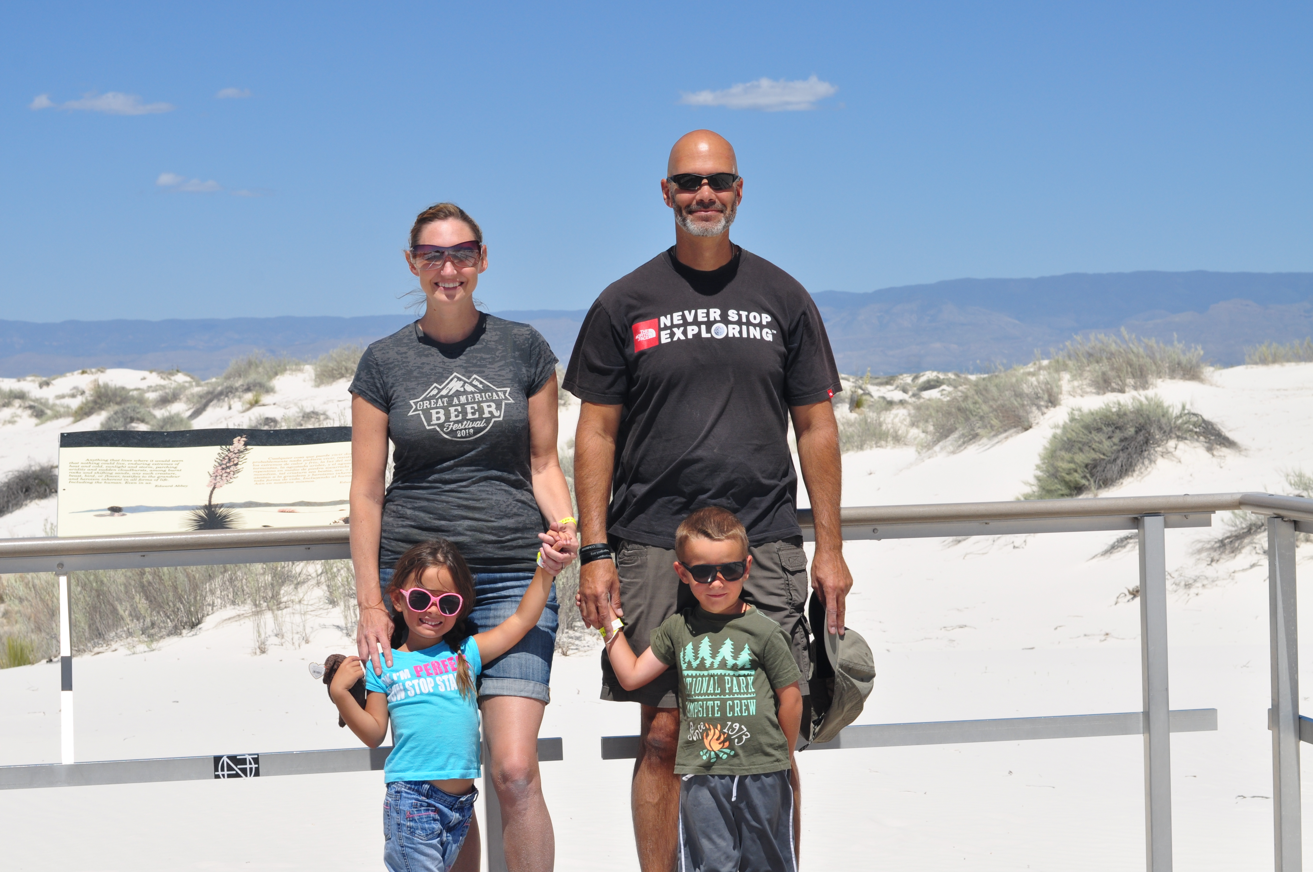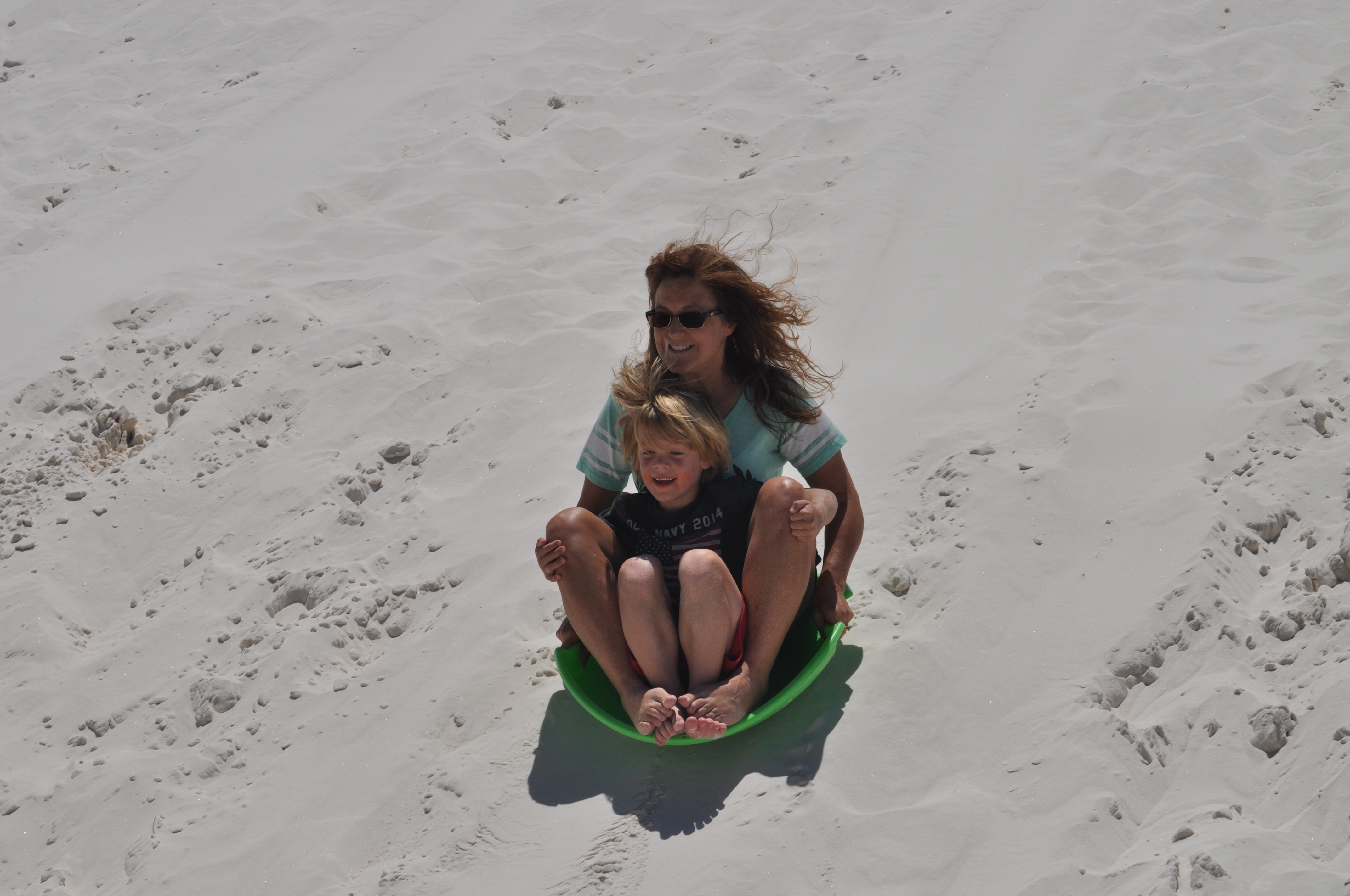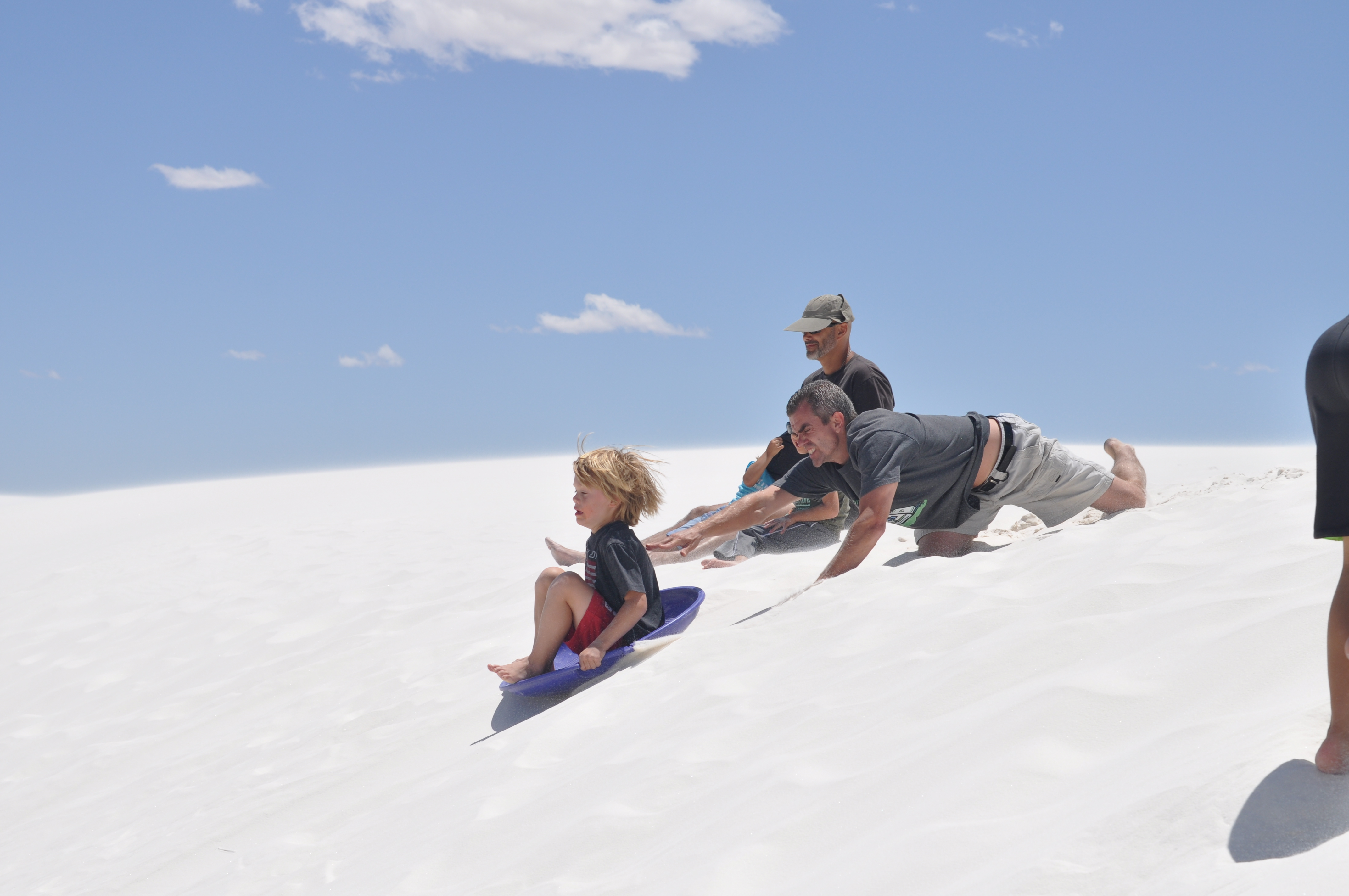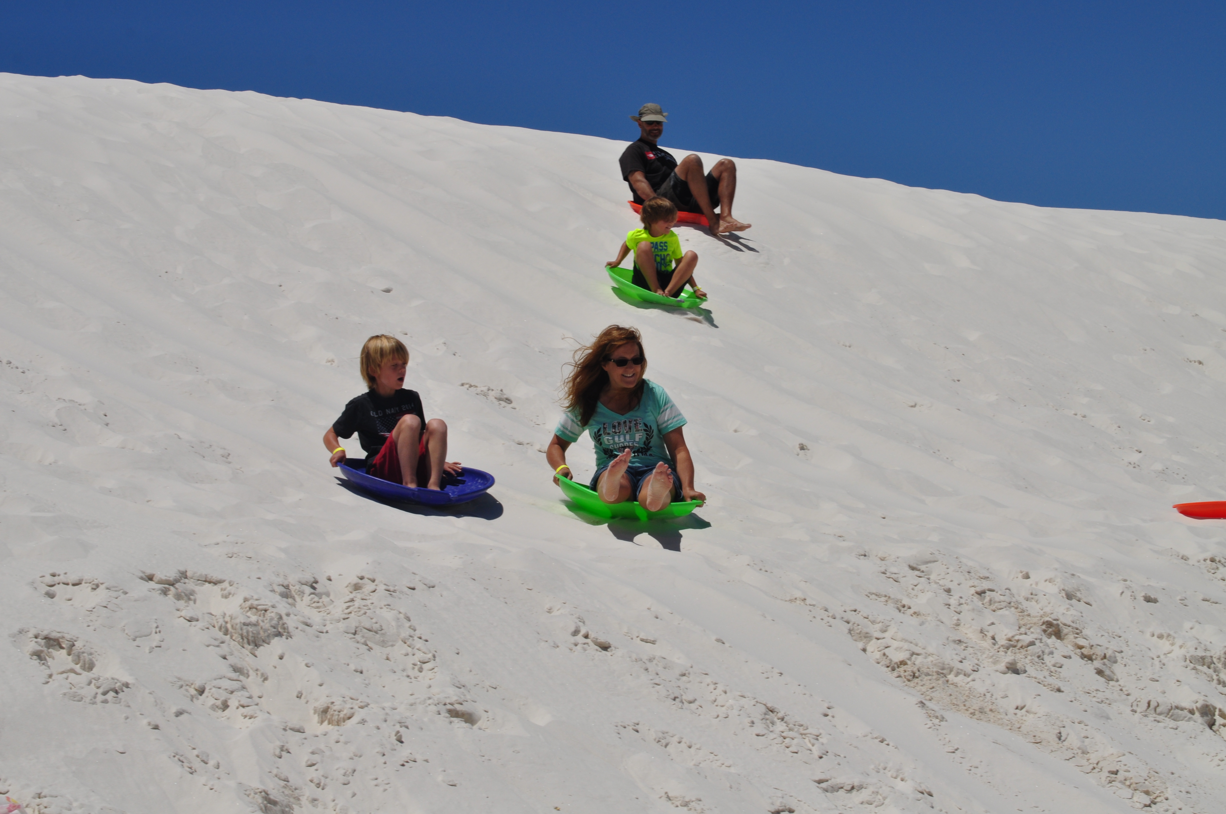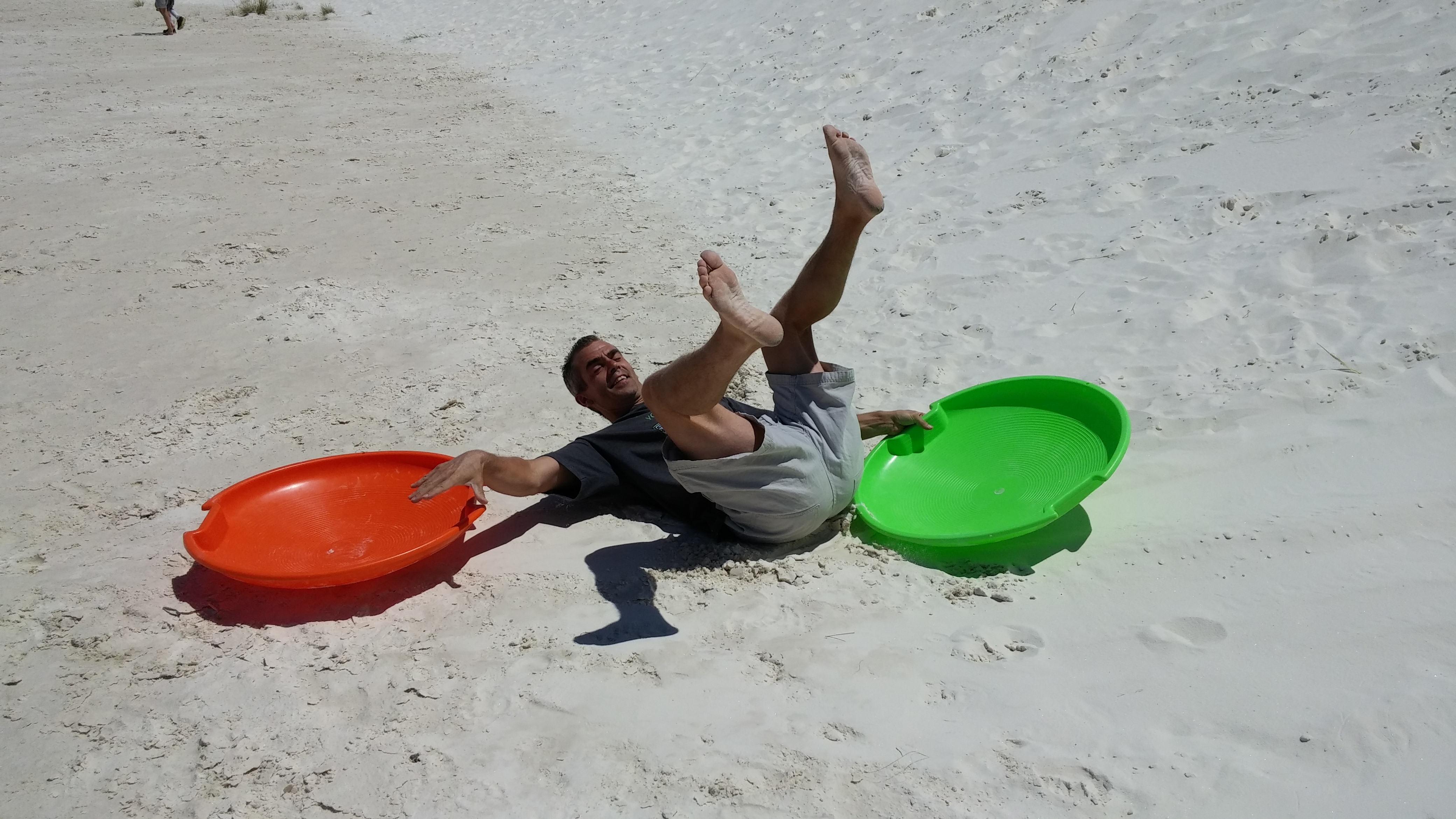 While visiting Las Cruces, NM we went to visit White Sands National Monument for a day.  It was an amazing thing to see!  I felt like we were back in Florida at the beach with all the sand dunes, but there was no ocean.  Just sand, and lots of it.  The sand is so white that it looks like snow and you can even go sledding on it.  So that’s what we did.  We spent the day sledding in shorts, how strange is that?  And what made it even better was spending the day here with another Fulltime Family.
