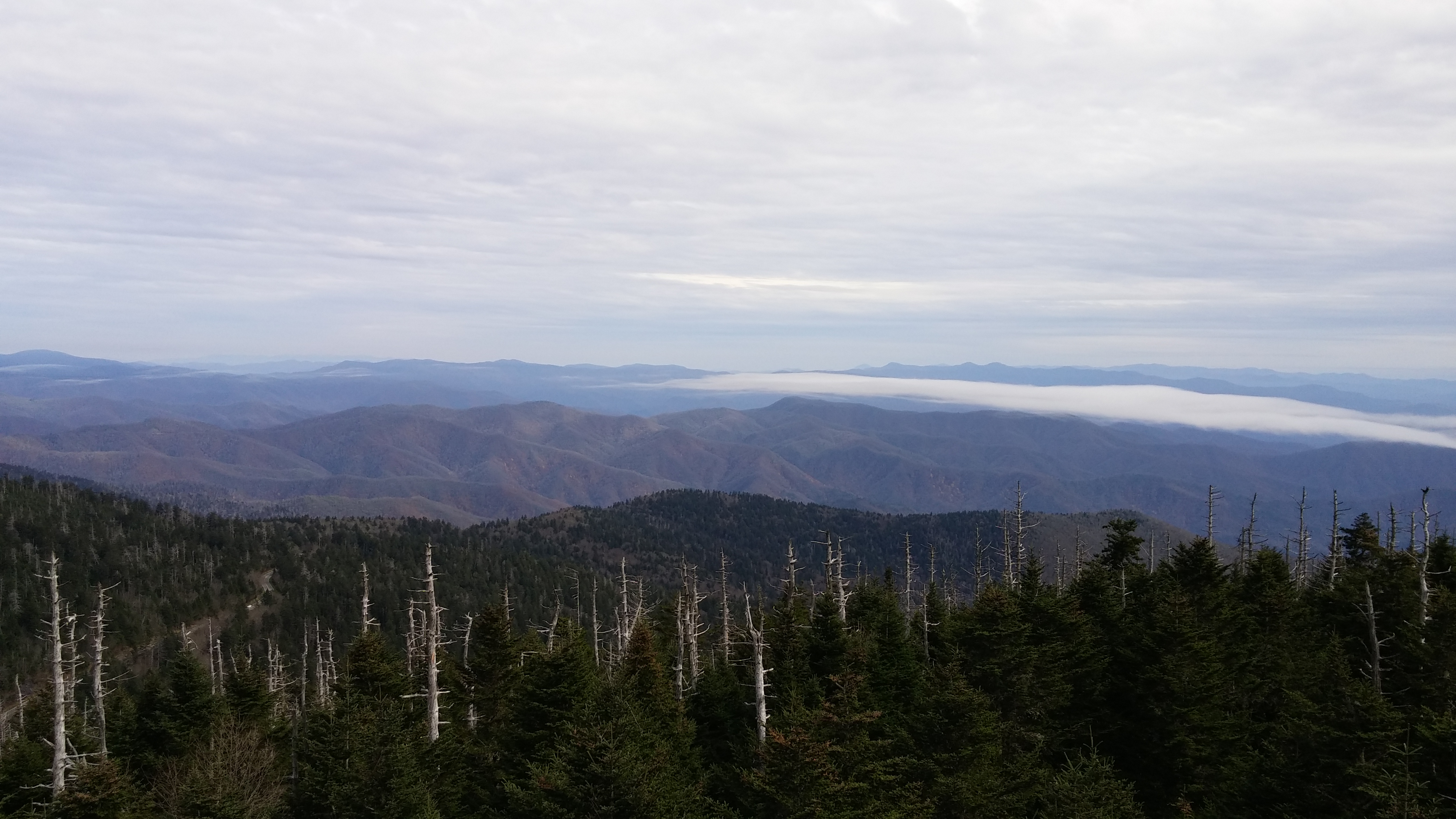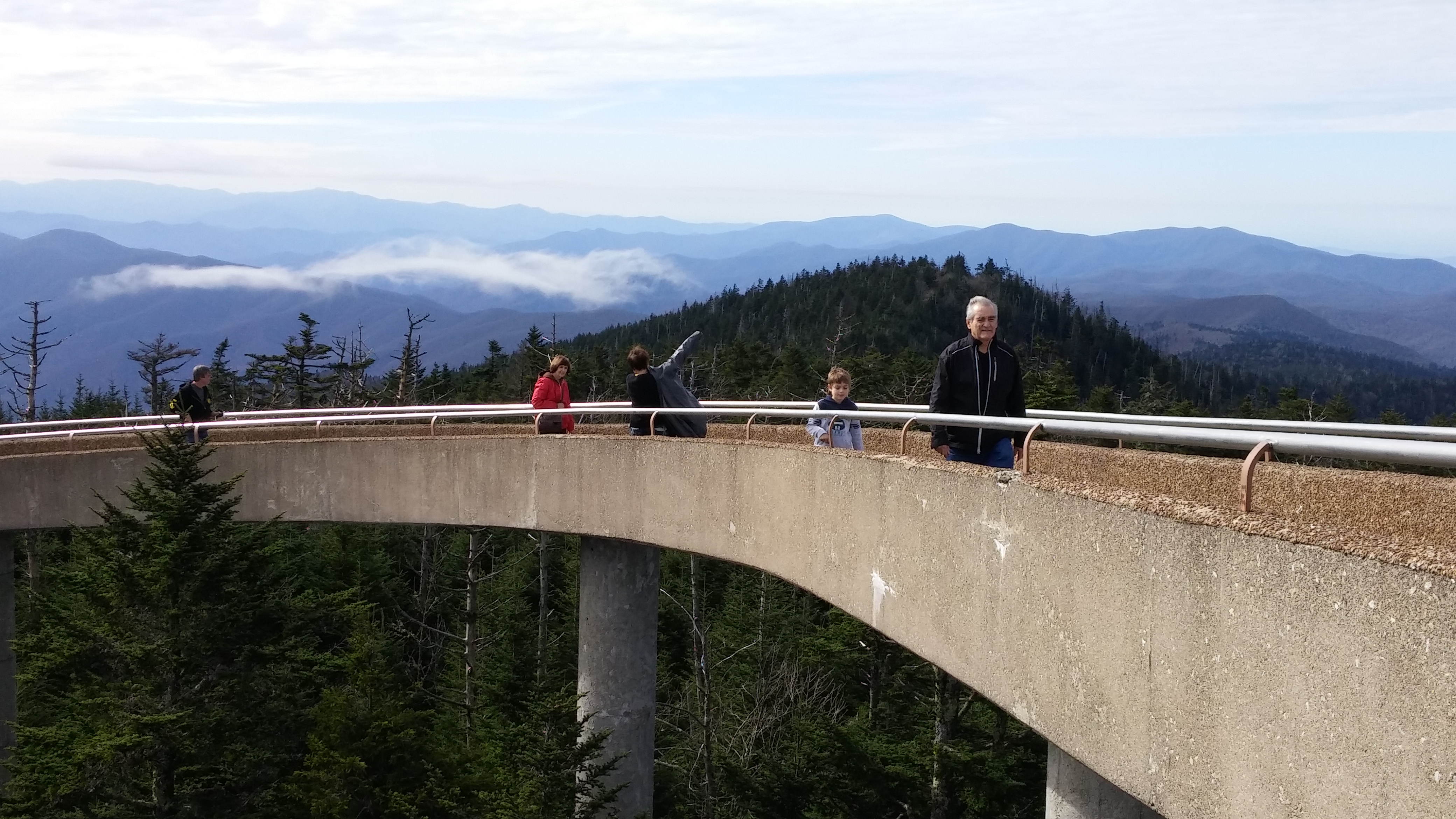 Then we went up to Clingman’s Dome.  This was a strenuous uphill hike that I’m afraid had my parents wondering why they had decided to join us for this.  But this was the highest point in the park with beautiful views.  It was quite chilly up there too!