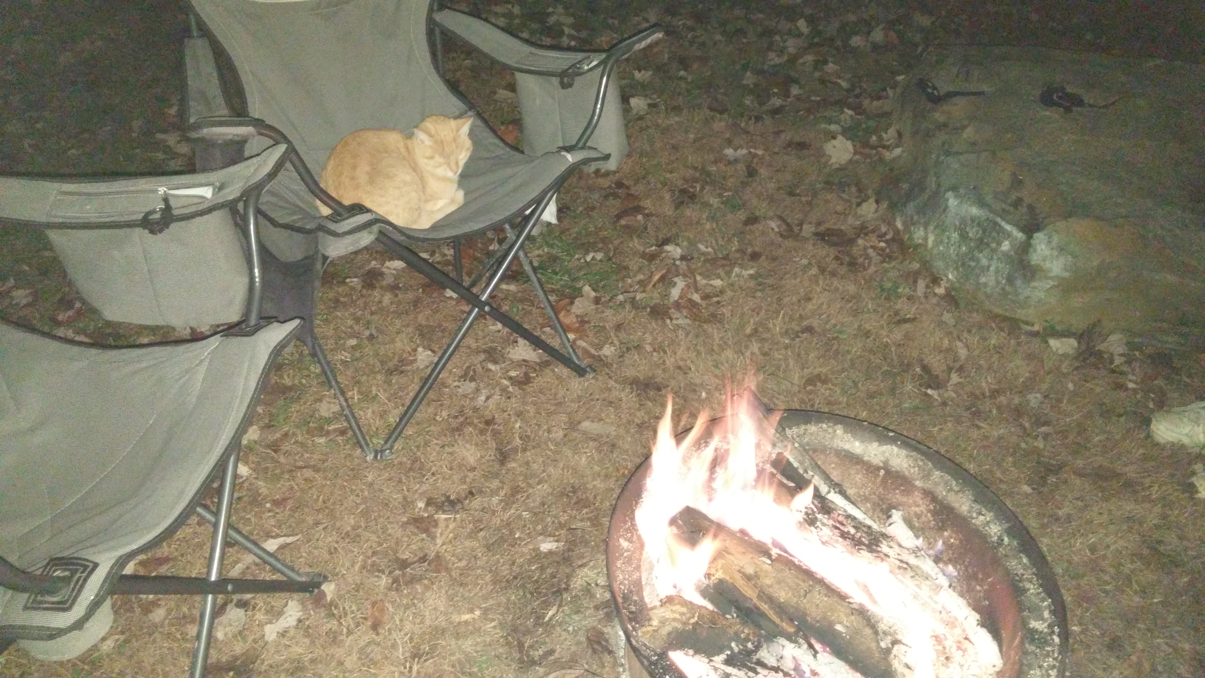 We almost adopted a new cat while we were staying in Cherokee.  This little stray cat came to visit us at our campfire each night.  It might have had something to do with the fact that Chris kept feeding it, I don’t know!   🙂    Anyway this cat loved sitting by the fire because the nights were so cold!  Fat Cat and this cat did not get along very well though so we still only have one cat.  For that I am thankful, one is enough!