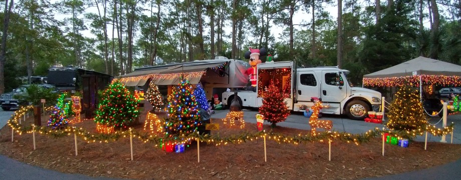 We took a break from Disney (as if we ever need a break from Disney!) and went to visit my sister and brother-in-law in Atlanta and then my parents in Charlotte for Thanksgiving. Then it was right back to Ft. Wilderness for my favorite time of the year to be there. The way some campers decorate their campsites is something to see! We like to rent a golf cart whenever we’re there in December so that we can ride around the camping loops at night and check out all the decorations. Ft. Wilderness is huge! Having a golf cart to get around is nice, but certainly not necessary. They have internal bus transportation to take you all over the resort if you don’t have a golf cart. Disney charges way too much for golf cart rentals so we rent from someone off property for half the price Disney charges. Keep that in mind if you go, there are other options. 😉