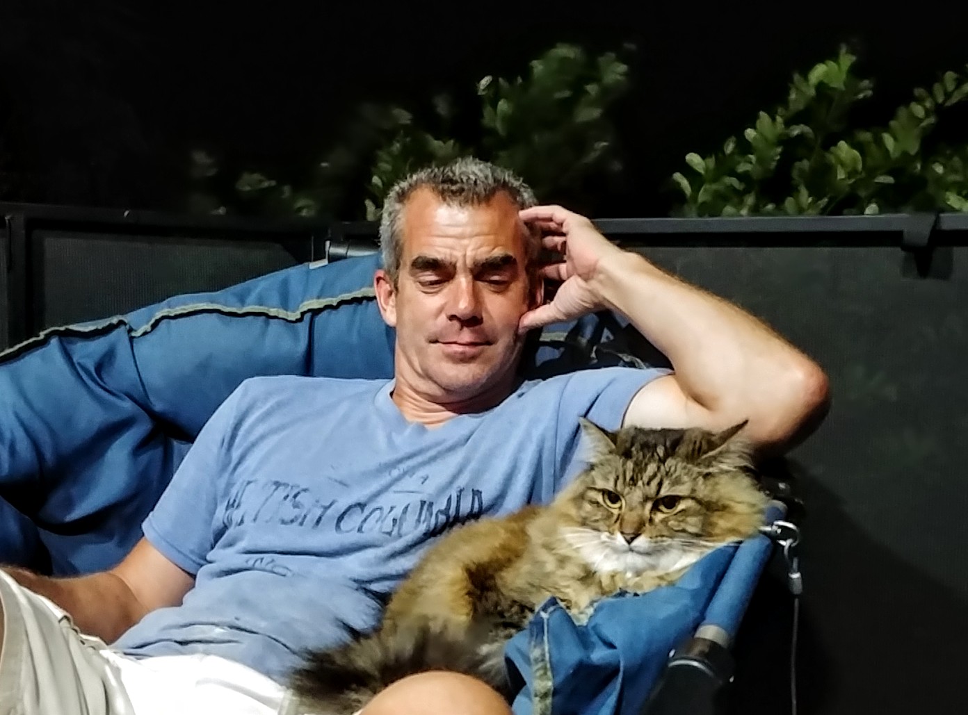 I’ll leave you with this cute picture of Chris and Fat Cat that I took one night sitting outside on our back deck. She always looks so grumpy! 😉