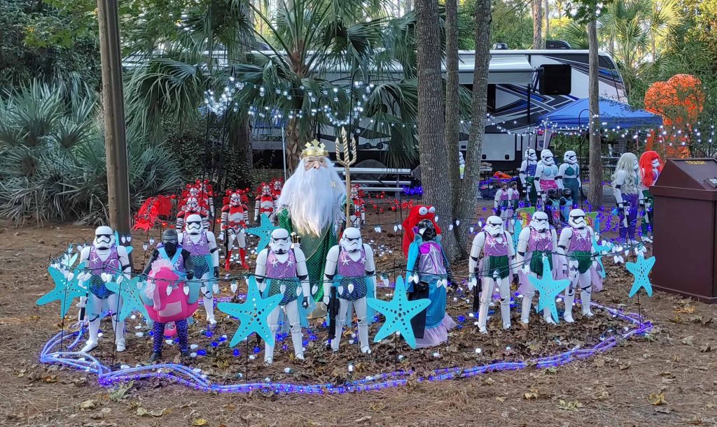 We had a quick visit to Disney’s Fort Wilderness campground after the Keys. I love staying at that campground even when we don’t have Disney tickets. We were there in October and rented a golf cart so we could ride around the camping loops and look at all of the Halloween decorations. My favorite site was the one with all the Stormtroopers dressed up in Little Mermaid costumes.