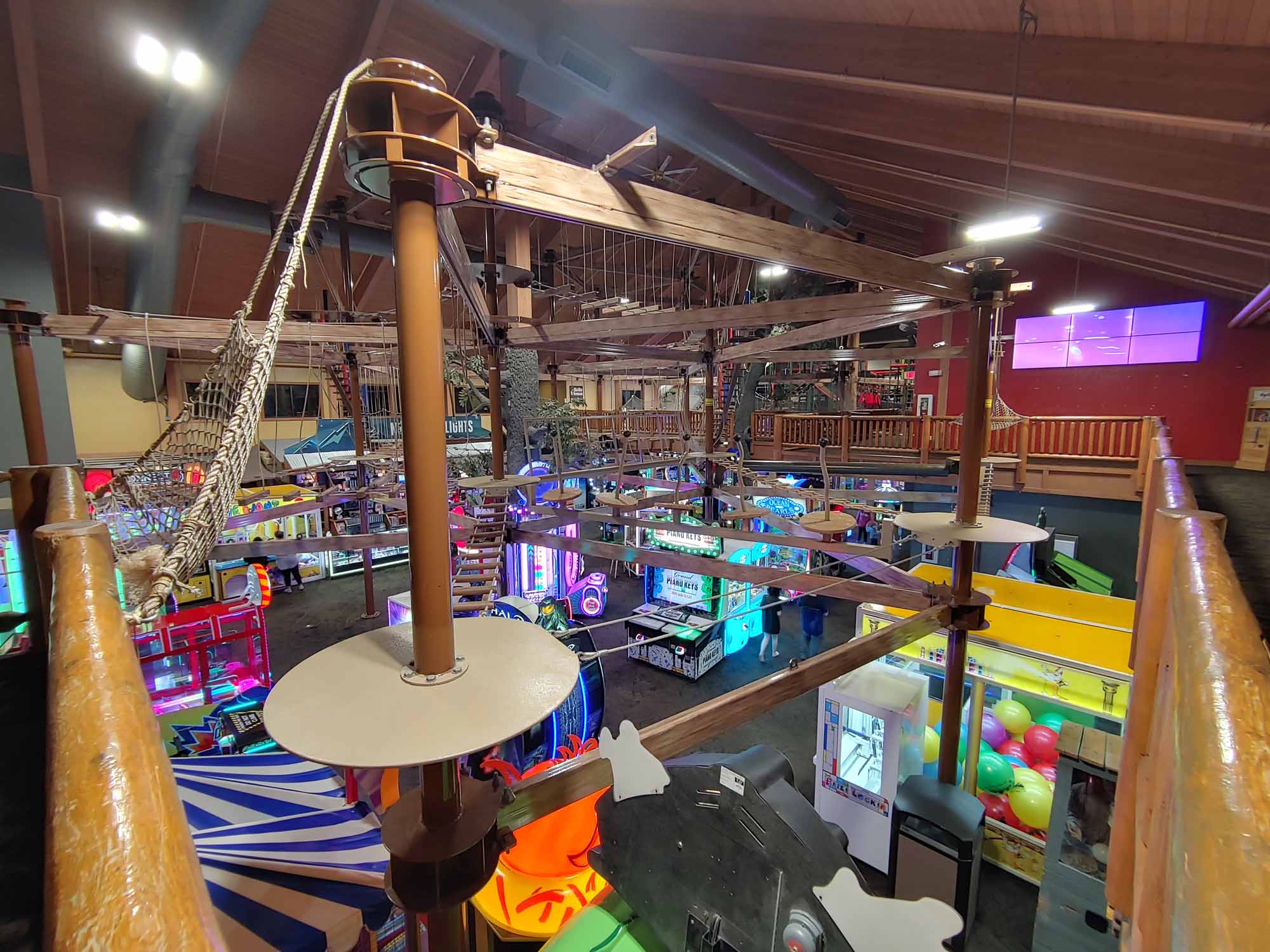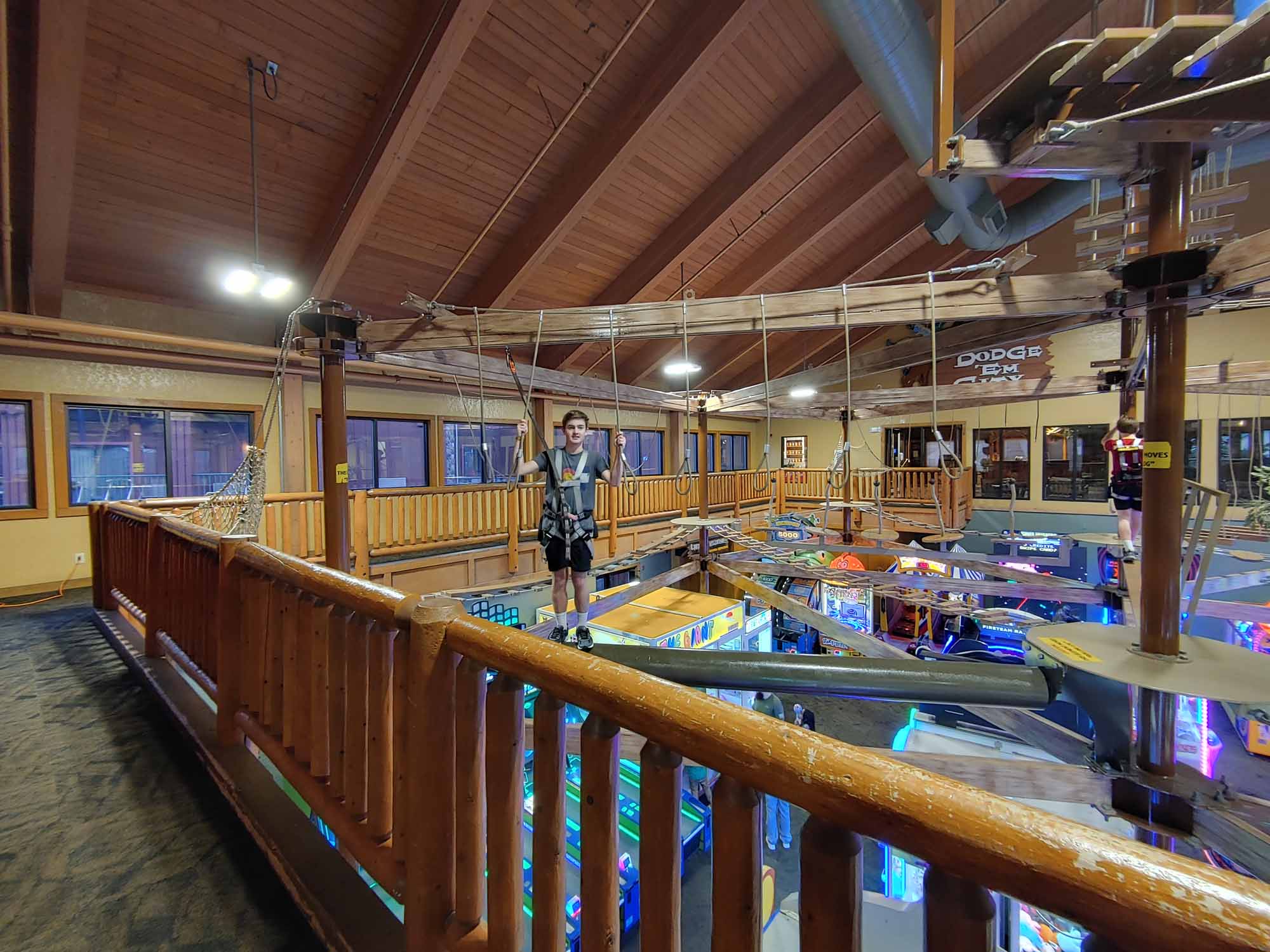 Walking on the ropes course above the arcade was a little scary. I kept seeing people below me and hoping I wouldn’t fall on them. Of course I couldn’t have fallen on them since I was secured with a harness, but I was still nervous the whole time anyway.